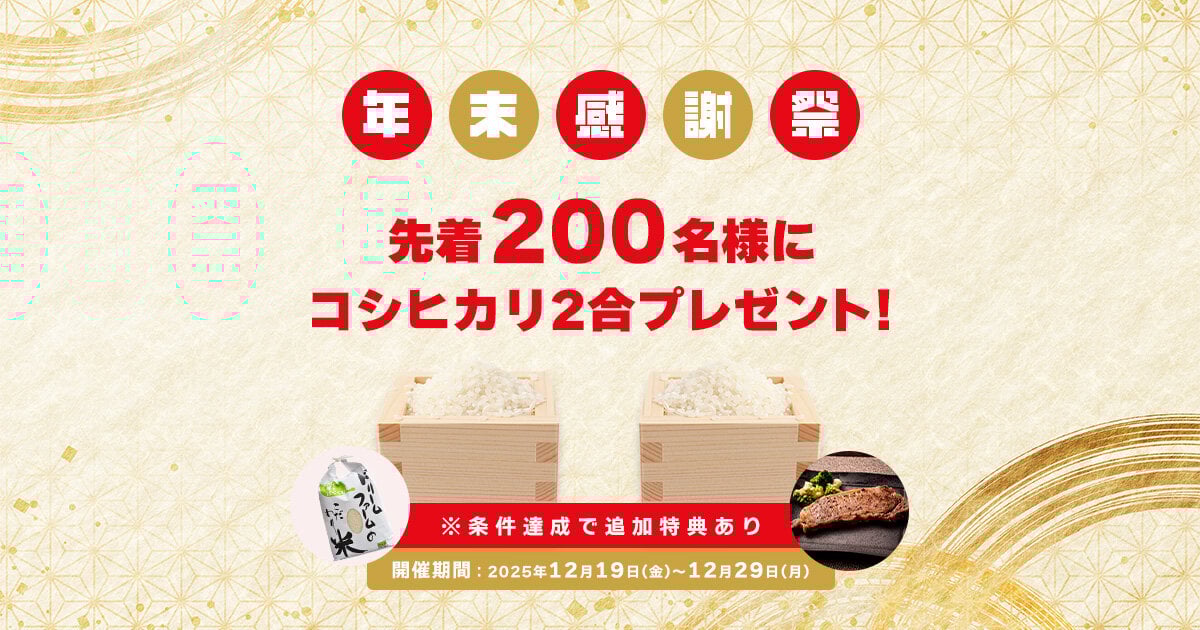 新米コシヒカリ2合を先着200名様にプレゼントします。